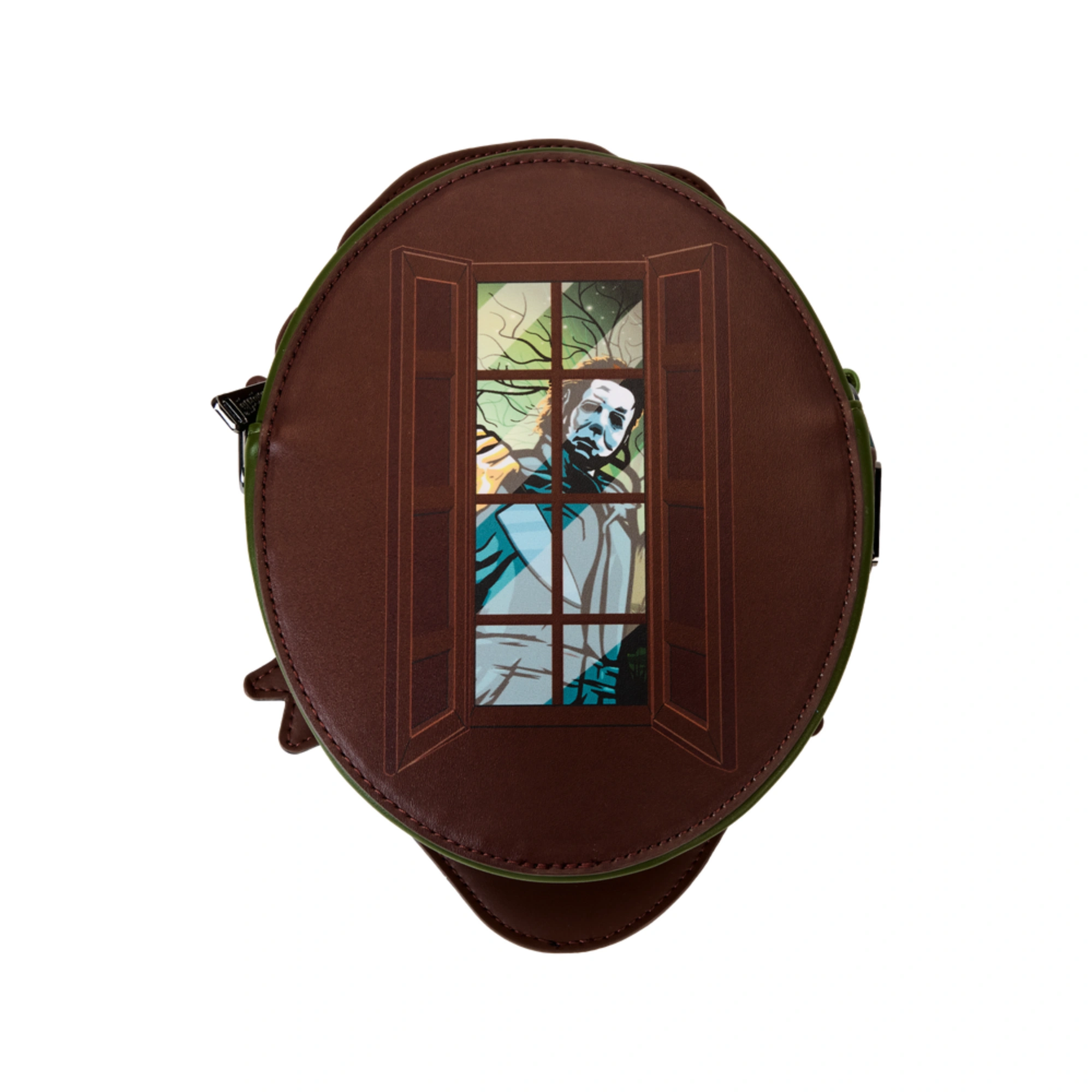 Con una silueta ovalada tipo “canteen”, la Halloween Michael Myers Bolsa Crossbody presenta en la parte frontal la aterradora máscara de Myers en aplicaciones y acabados de impresión de alta calidad. Lo mejor es que, en la oscuridad, la máscara brilla, resaltando aún más su diseño escalofriante. En la parte trasera, encontrarás una ilustración de Michael Myers espiando a través de unas persianas, añadiendo un detalle siniestro que todo fan reconocerá.