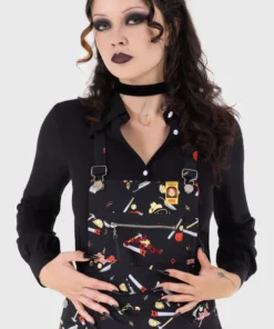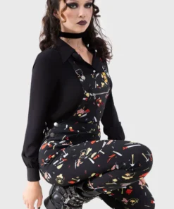 Confeccionada en tela suave y elástica, esta pieza ajustada presenta un estampado integral de Chucky que no pasa desapercibido. Los detalles bordados y el tirador de cierre en forma de cuchillo personalizado elevan el diseño a otro nivel, mientras que los bolsillos, correas ajustables y cierre lateral con botones aseguran comodidad y versatilidad. Ideal para quienes buscan fusionar moda alternativa con un homenaje al cine de horror clásico.